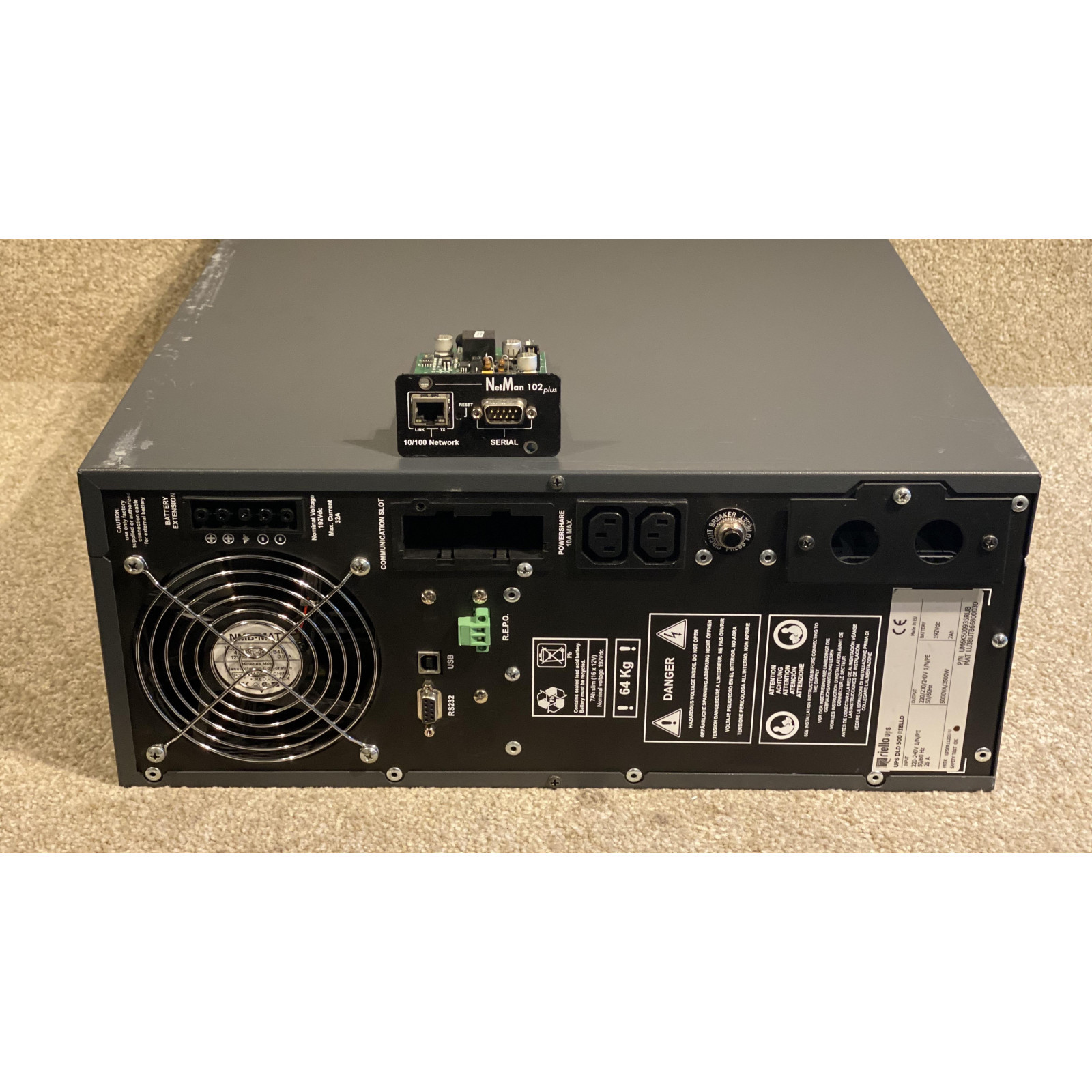 The UPS comprises a power module and a battery module, linked together. We are rebuilding the battery modules with new cells. The UPS has a network card, which we are including but have not reset or tested.